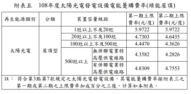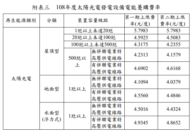 民國108年(西元 2019年)購電費率