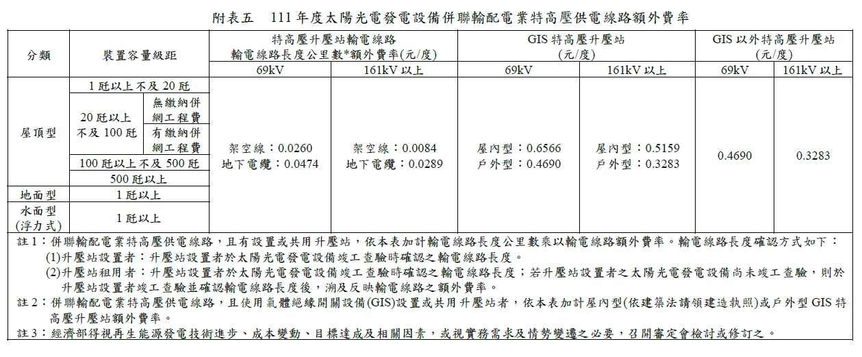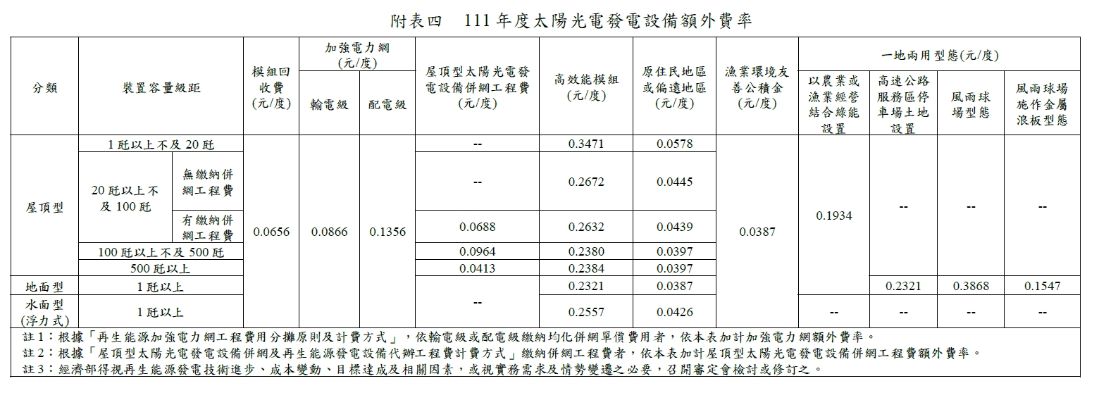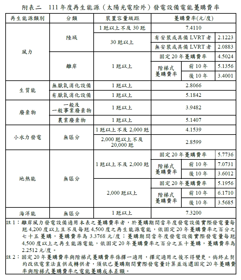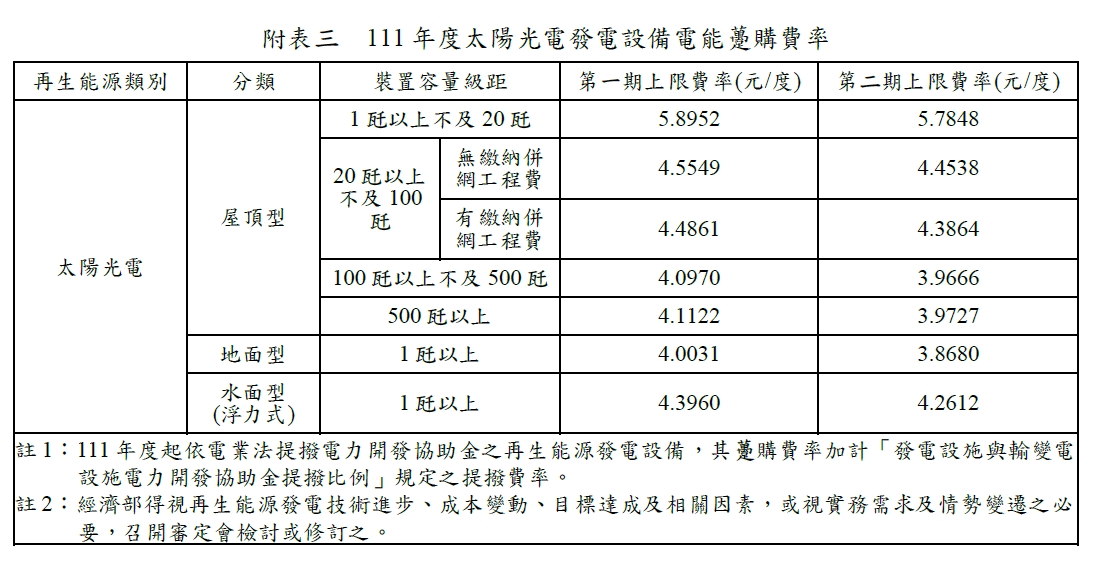 民國111年(西元 2022年)購電費率